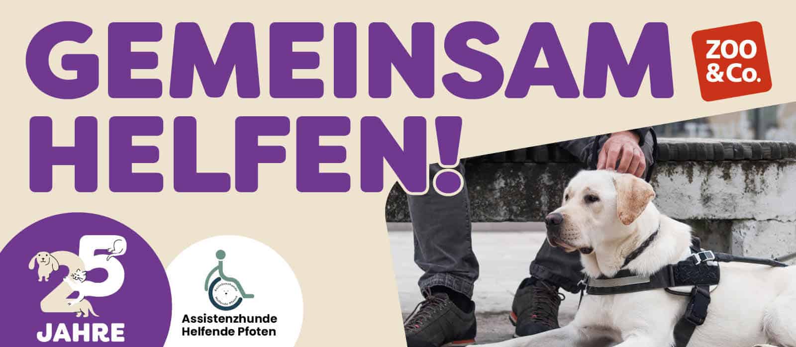 Im Jubiläumsjahr 2026 setzt ZOO & Co. gemeinsam mit Kund:innen ein Zeichen und unterstützt mit einer Spendenaktion in teilnehmenden Märkten und auf zooundco.de die Ausbildung von Assistenzhunden bei der Helfende Pfoten gGmbH.